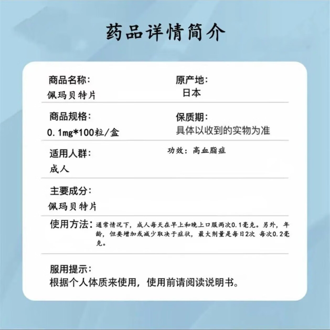 日本原装进口佩玛贝特降血脂片一盒100粒